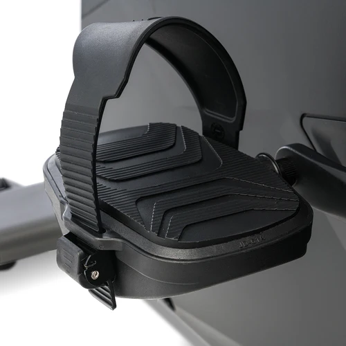 De gepolsterde pedalen zijn 2° naar binnen gekanteld om uw lichaam tijdens de training in een anatomisch correcte positie te brengen. Het schuimrubberen zadel met dubbele vering is eenvoudig te verstellen met de gele hendel.